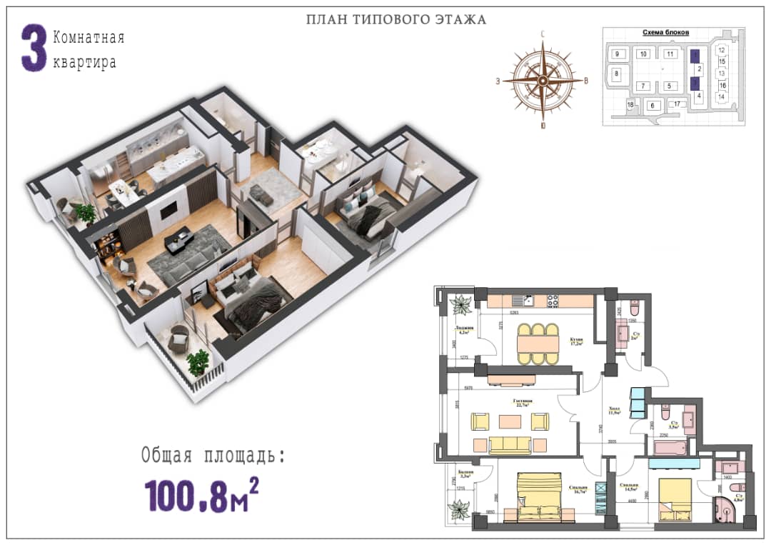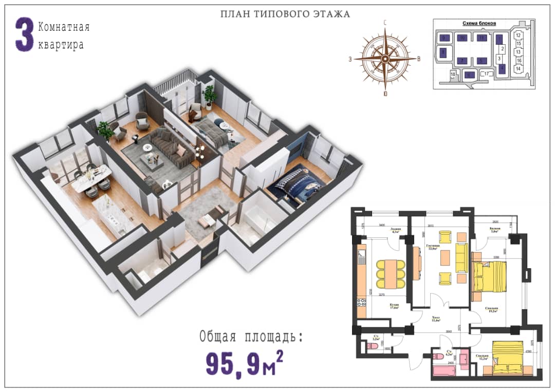 3-бөлмөлүү: 96 кв.м., 101 кв.м..
