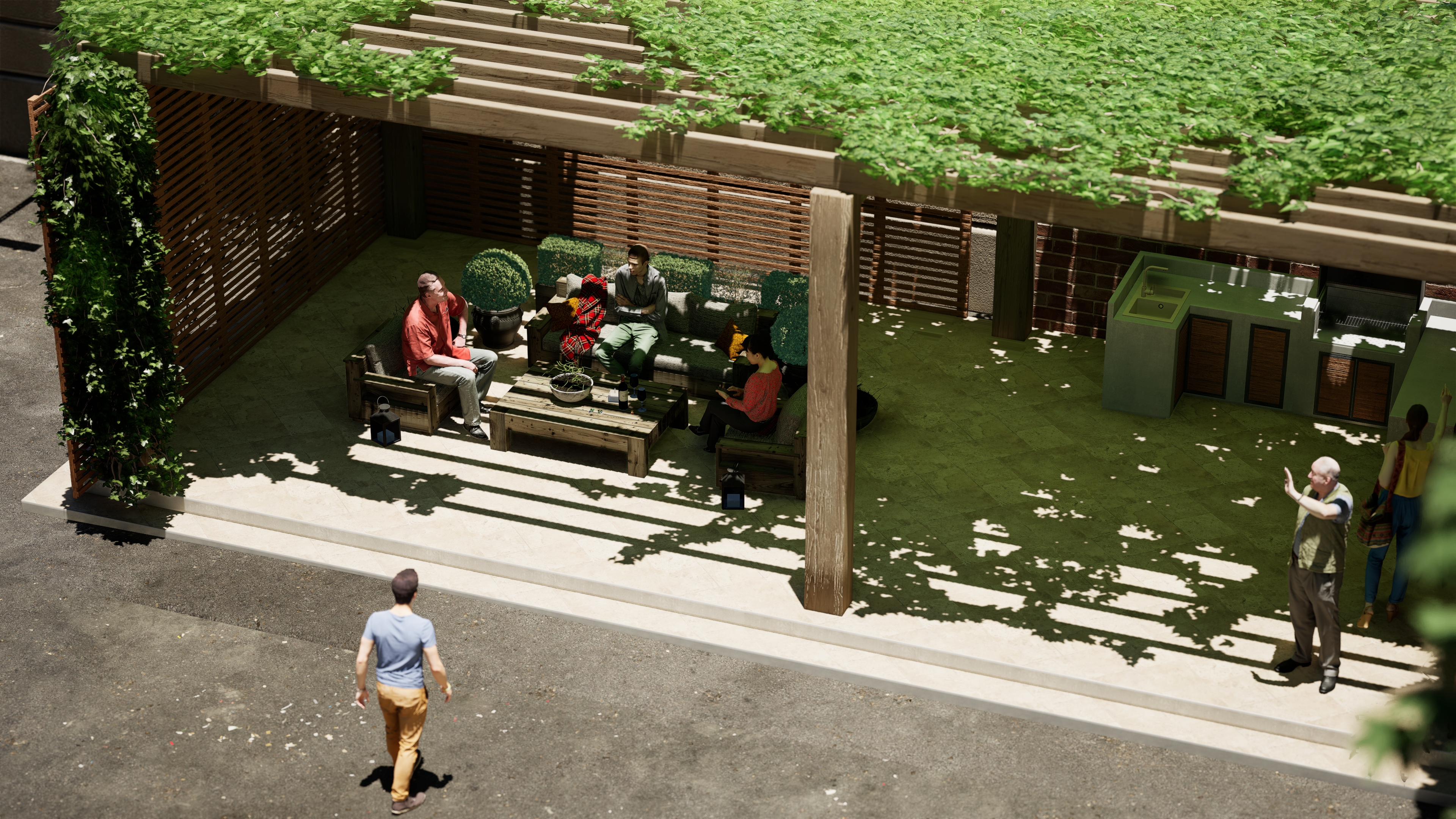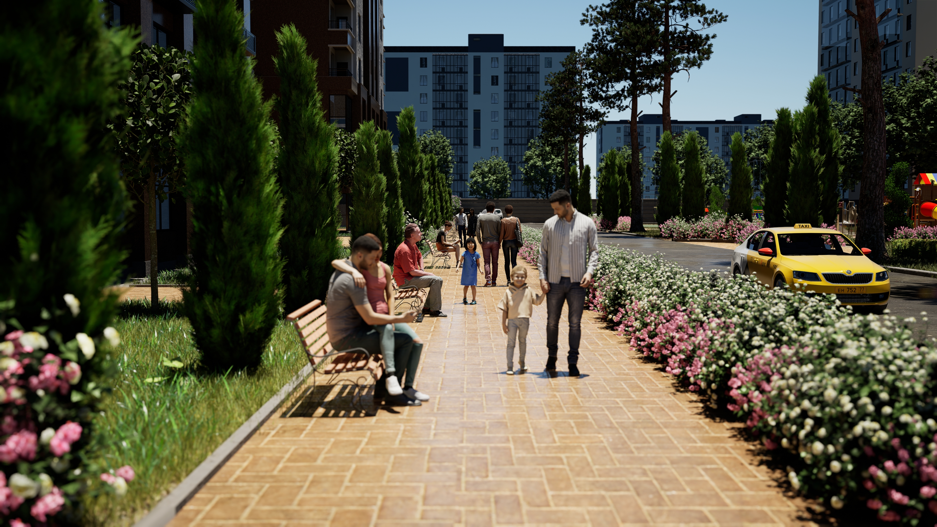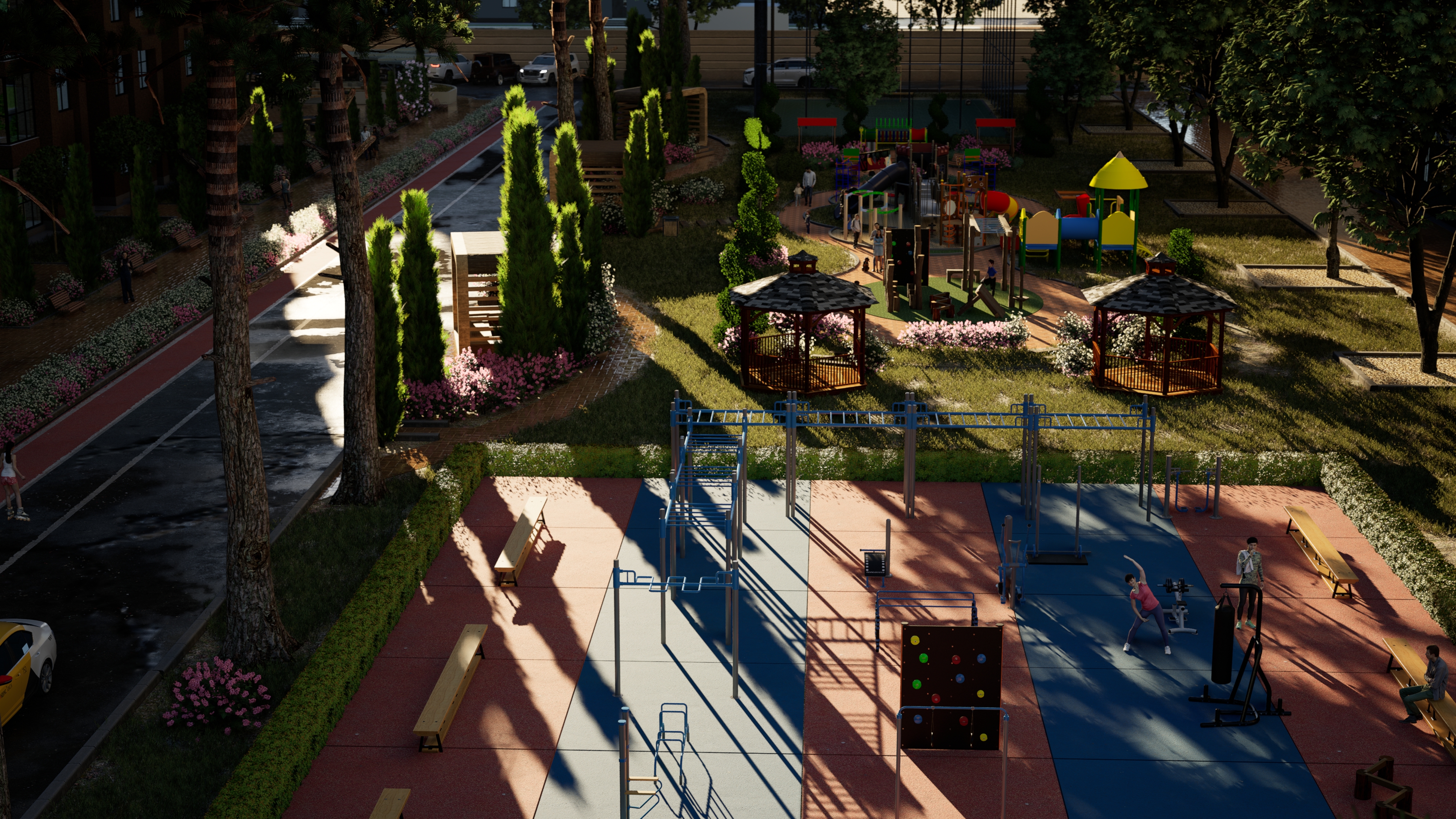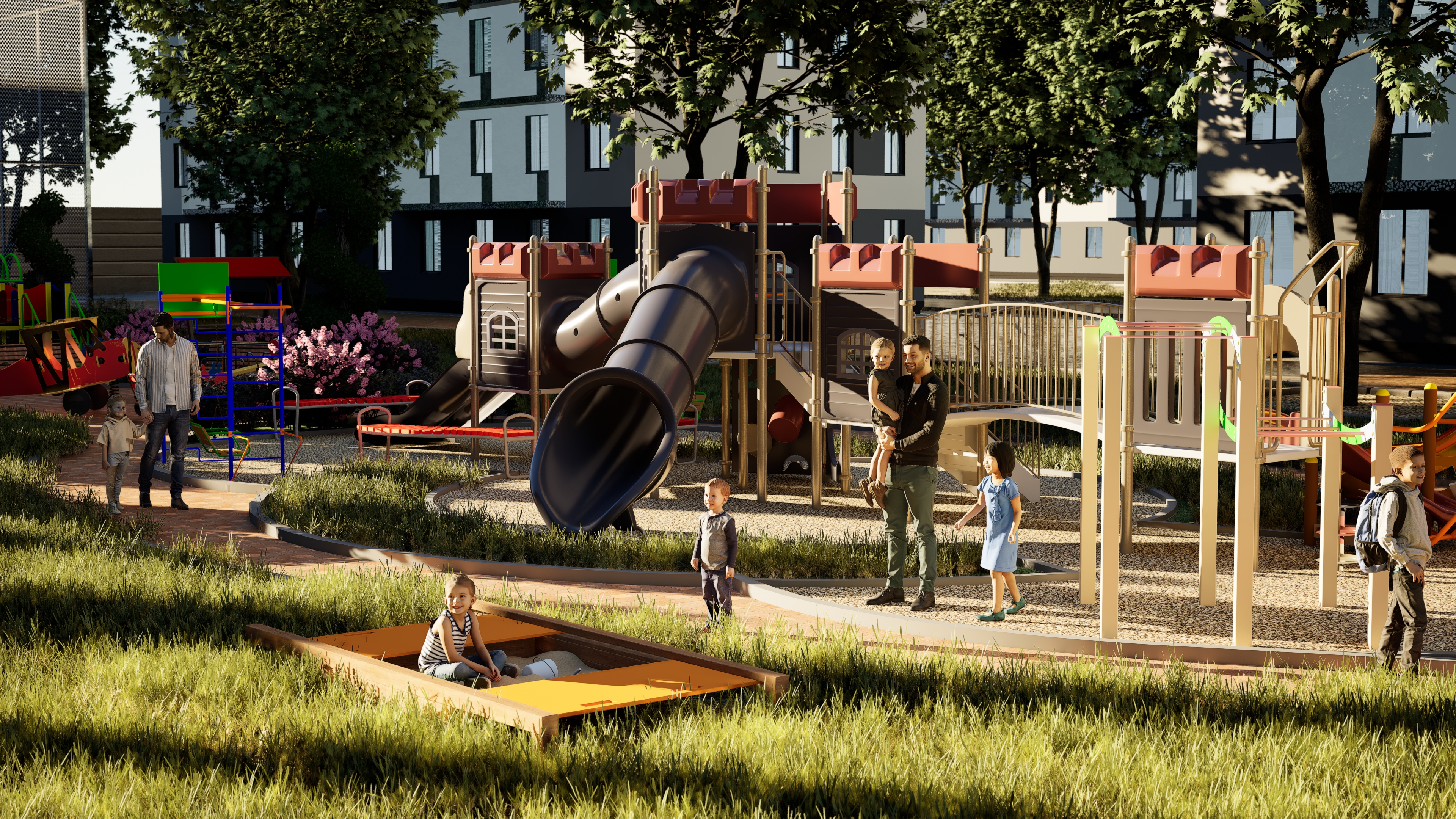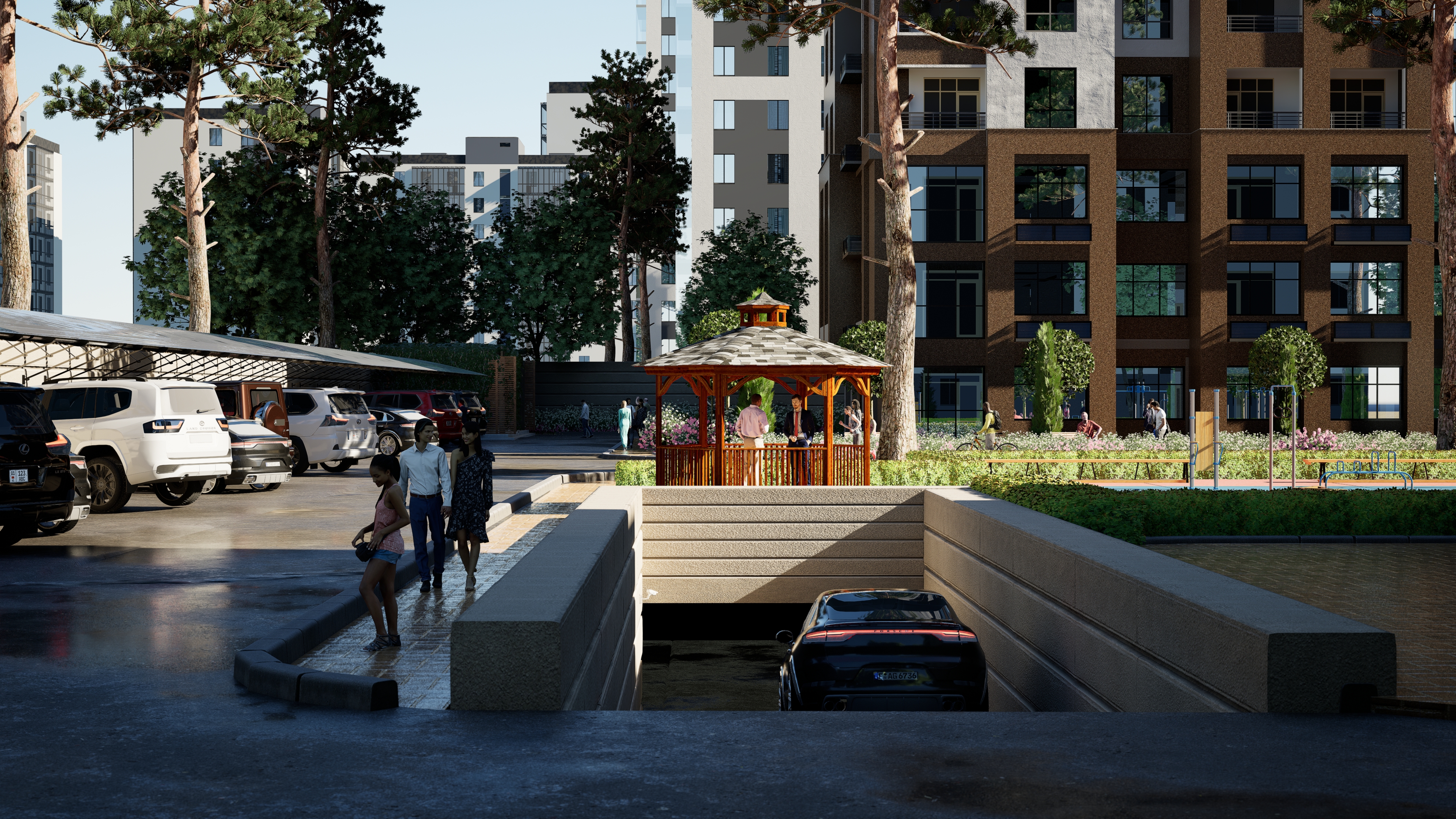Биз эс алуу зоналарын, спорттук жана балдар аянтчаларын, ошондой эле жер төлөдөгү автоунаа токтотуучу жайларды сунуштайбыз.